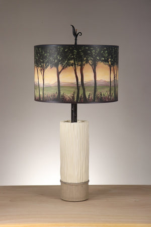Handcrafted, giclée drum shade featuring our Dawn pattern. Shown on our individually hand carved pottery base in ivory glaze, topped with a hand forged, detailed steel extension and finished with a locally turned poplar wood base. Shade is signed, dated, and hallmarked. Pewter finial in a steel oxide finish.